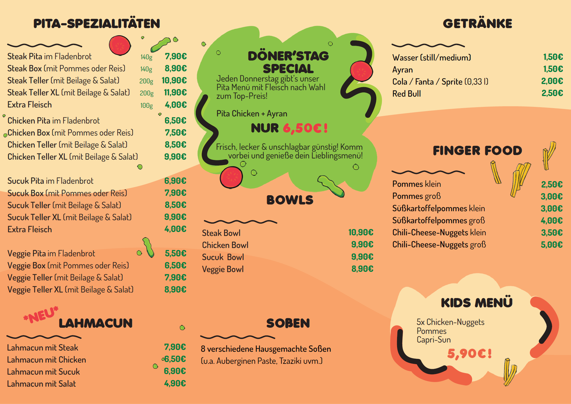 Entdecke unsere Karte, auf der jede Pita eine einzigartige Variante deiner Lieblingsgerichte bietet. Von saftigem Fleisch, knusprigen Fritten bis zu leckeren Veggie-Optionen!